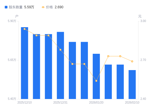 日期A股户数(户)流通A股户均持股数(股)户均持股市值(万元)2026-02-105585635108.299.442026-01-315621234885.949.522026-01-305621234885.949.522026-01-205690434461.708.752026-01-105766634006.329.082026-01-095766634006.329.082025-12-315831133630.179.352025-12-205816733713.429.742025-12-195816733713.429.742025-12-105861533455.759.84